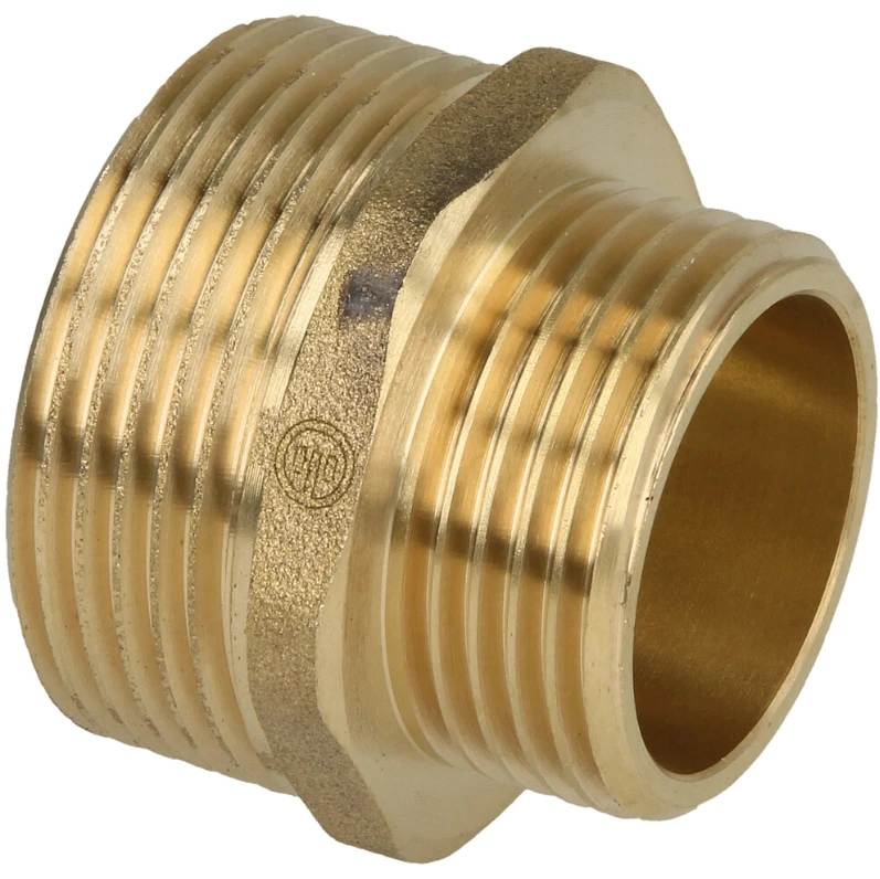 Dubbele nippel verloop 1 1/4″ Bu x 1″ Bu met 6-kant – blank messing