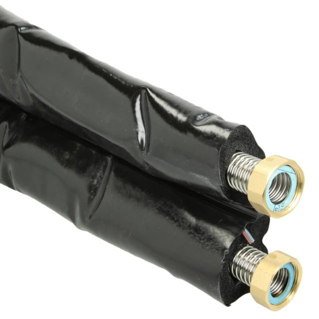 De dubbele RVS golfbuis (voor bovengronds) is specifiek ontwikkeld voor toepassingen in warmtepomp en solar systemen. Samen met een sensorkabel (die niet wordt gebruikt icm een warmtepomp) is deze buis omhuld met effectieve HT-isolatie. Door het gebruik van hoogwaardig roestvrij staal (V4A) kan deze golfbuis op diverse manieren worden ingezet in zowel particuliere, commerciële als industriële sectoren, met inachtneming van geldende voorschriften.