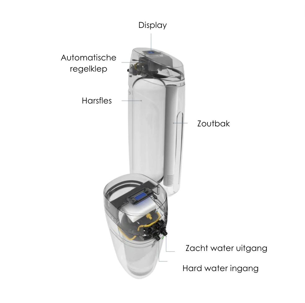 Het resultaat is dat het water dat uw waterontharder verlaat, vrij is van calcium en magnesium en daardoor zachter is. De hoeveelheid natrium die aan het water wordt toegevoegd, is zo klein dat het veilig is voor huishoudelijk gebruik. Dit eenvoudige maar effectieve proces helpt kalkaanslag in leidingen en apparaten te voorkomen, waardoor de levensduur van uw apparatuur wordt verlengd.