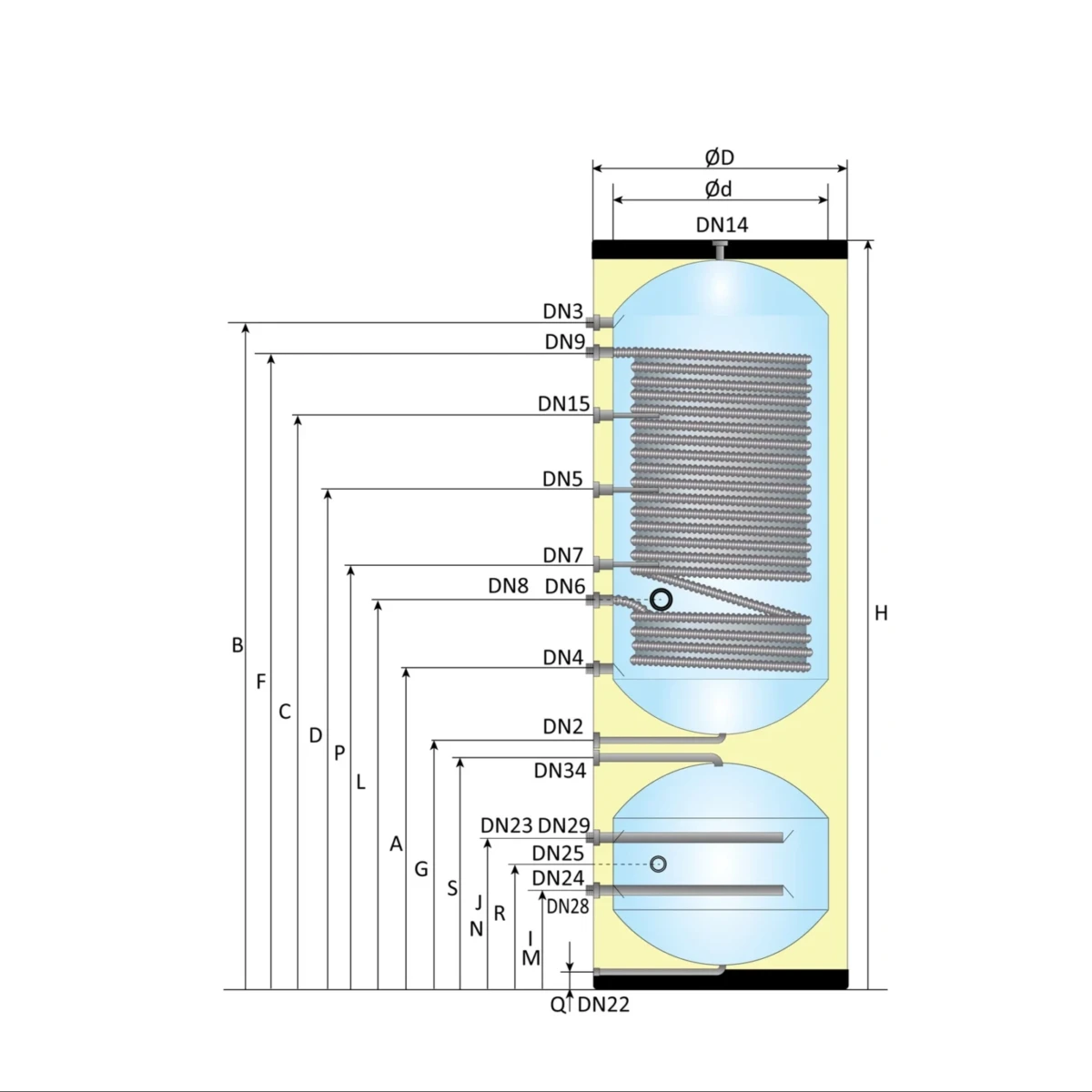 De PDWT is een gecombineerde 2-in-1 hygiëneboiler en buffertank voor warmtepompsystemen, werkend volgens het doorstroomprincipe. Deze slimme combinatie zorgt voor efficiënte tapwaterbereiding én buffering van het verwarmingssysteem in één compacte oplossing.