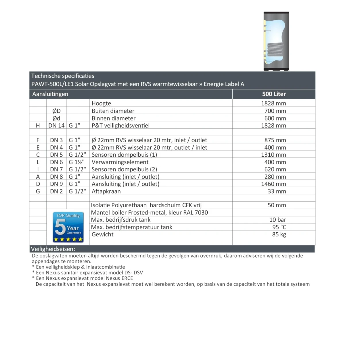 De PAWT-500L/LE1 maakt deel uit van de NEXUS RVS serie en voldoet aan de productiecontrole volgens de Europese richtlijn 2014/68/EU (module A). Dankzij de geavanceerde lastechniek beschikken deze boilers over een internationaal hoog en duurzaam kwaliteitsniveau, gecombineerd met een elegante uitstraling en uitstekende corrosiebestendigheid. Ideaal voor grotere zonneboilerinstallaties waar capaciteit, rendement en betrouwbaarheid centraal staan.