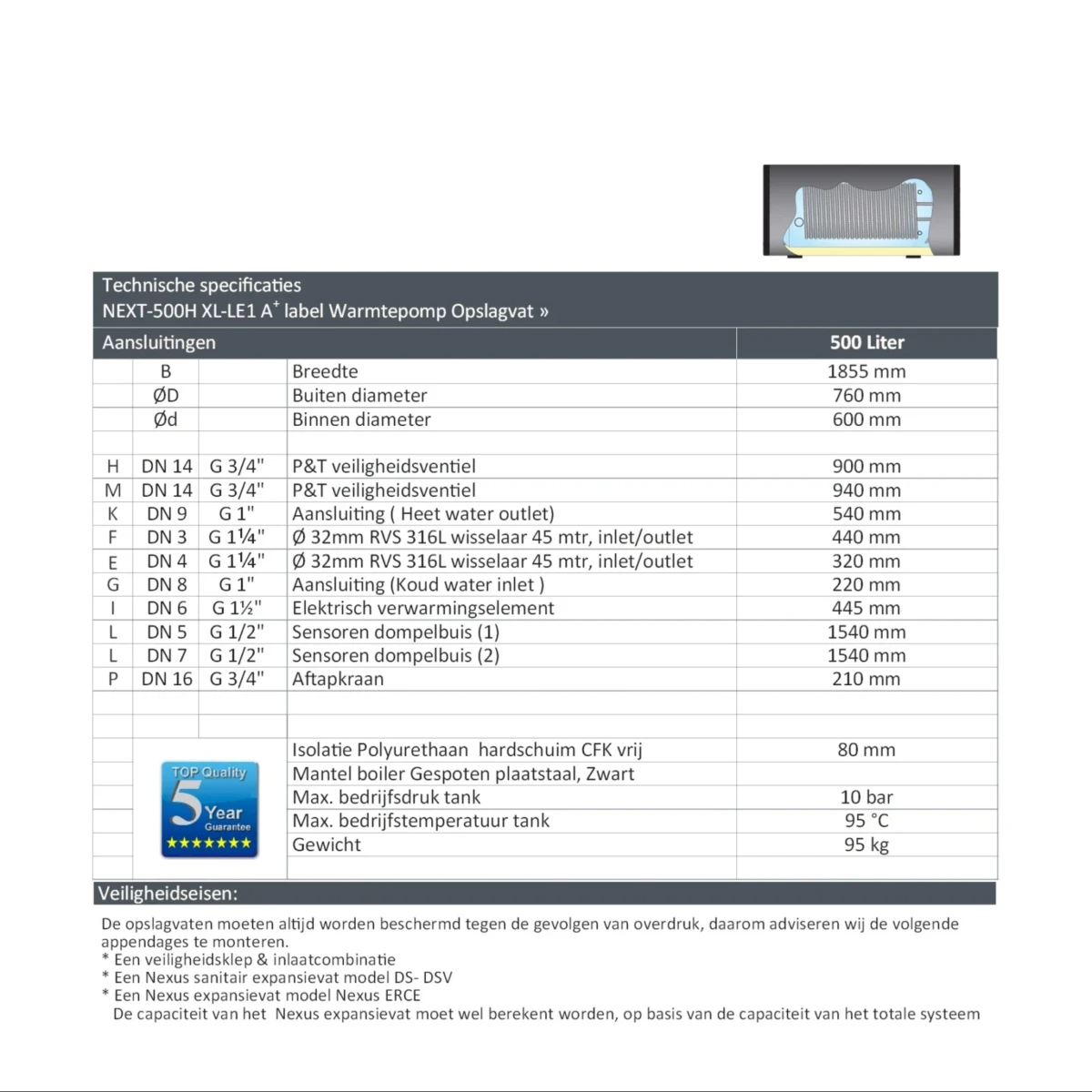 NEXT-500H XL-LE1 – A+ Label 500 Liter Horizontale Hygiëneboiler