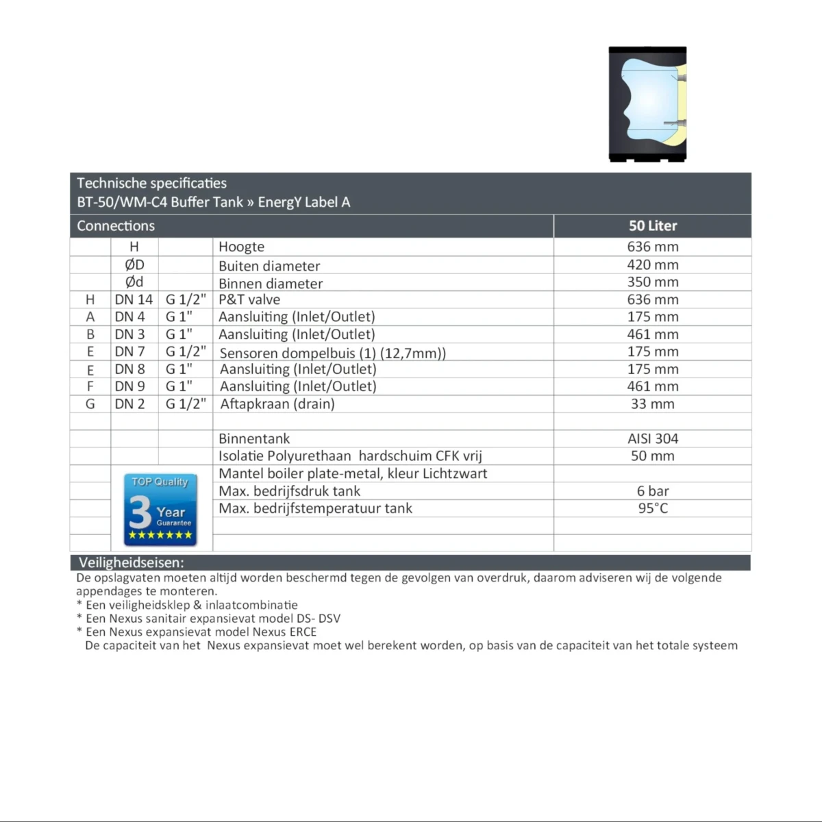 De B-Series BT-50 maakt deel uit van de NEXUS RVS buffertankserie en voldoet aan de productiecontrole volgens de Europese richtlijn 2014/68/EU (module A). Dankzij de geavanceerde lastechniek beschikken deze buffertanks over een internationaal hoog en duurzaam kwaliteitsniveau, gecombineerd met een elegante uitstraling en uitstekende corrosiebestendigheid. Ideaal voor cv- en warmtepompinstallaties waar flexibiliteit in aansluitingen en een moderne afwerking gewenst zijn.