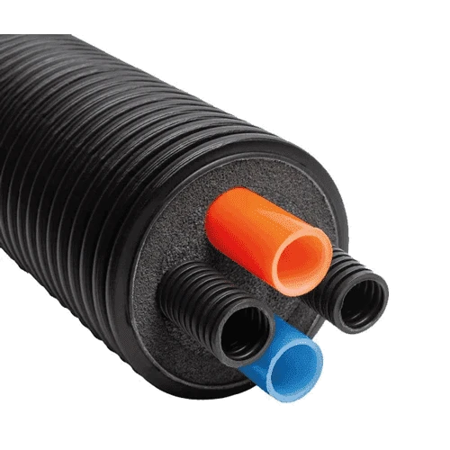 Geïsoleerd leidingsysteem met geïntegreerde componenten: twee verwarmingsbuizen en twee huls buizen voor elektrische bekabeling, samengebracht in één mantel. De verwarmingsbuis is uitgevoerd in SDR11 / PN6. De huls buizen, gemaakt van polypropyleen klasse 3422, zijn geschikt voor stroom- en/of sensorkabels. Dit Terrendis-systeem is specifiek ontworpen om lucht/water-warmtepompen te verbinden met woningen en woongebouwen. De verwarmingsbuis is vervaardigd uit vernet polyethyleen (PE-Xa), met een oranje buis voorzien van een zuurstofdiffusie scherm voor de aanvoer en een blauwe buis met hetzelfde scherm voor de retour van verwarmingswater.